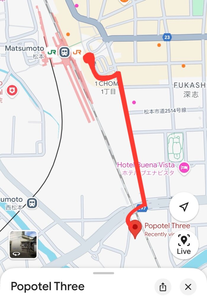 1. Exit Matsumoto Station from the Oshirouguchi (East Exit) and head to the right (south). Walk along the train tracks for about 6 minutes.
